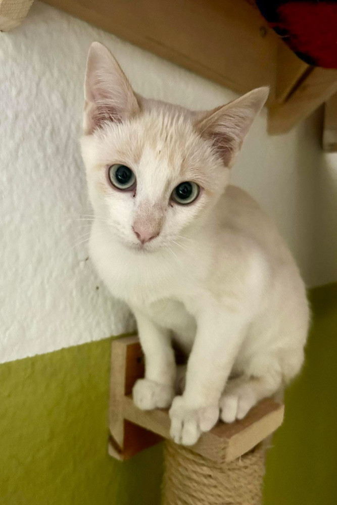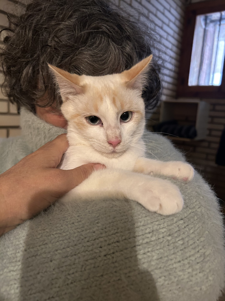 . Un gatico recogido de la calle con los ojitos enfermos, cerrados por las legañas, y muchos mocos. En un principio se recogió para dar antibiótico, curar y soltar; pero nos robó el corazón y, a pesar de no tener espacio, no pudimos devolverlo a la calle.